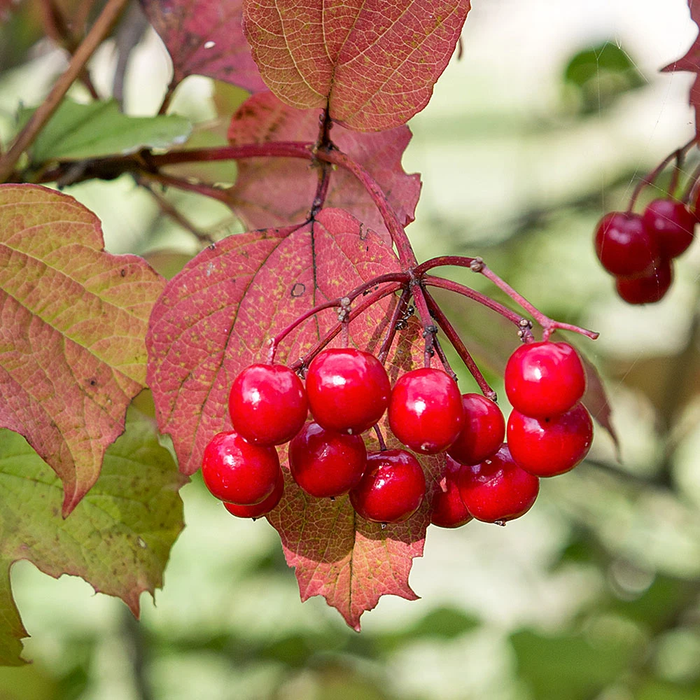 The american cranberry (Viburnum trilobum) is a lovely addition to any home landscape, with edible berries that are very similar in appearance/taste to a cranberry, but are not a true cranberry. This shrub moderate grower pushing out about 2 feet per year into a nicely rounded shape, reaching up to 10 feet wide/tall, it can be easily pruned for a smaller overall size. This is a cold loving plant, growing in USDA zones 2-7, but it does not care for heat or times of drought. This plant brings 3 seasons of attraction to your yard. Blooming in the spring with creamy, white flowers against dark green foliage. In the fall season the leaves turn shades of red, yellow and purple. The berries begin to ripen into a brilliant red that can persist throughout the winter providing food for you and woodland critters.